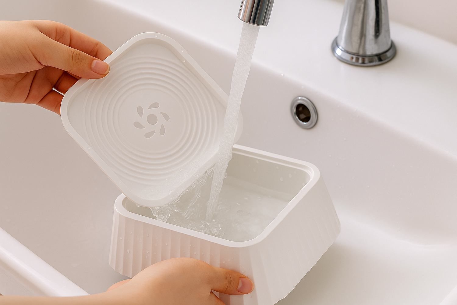 Der Wassernapf lässt sich in drei Teile zerlegen und in Sekunden reinigen. Glatte Oberflächen verhindern Schmutzablagerungen, und alle Komponenten können einfach abgespült werden. So bleibt der Napf hygienisch sauber und das Wasser länger frisch.