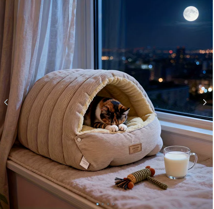 Das Premium Winter-Katzenbett bietet Katzen und kleinen Hunden einen warmen, komfortablen Schlafplatz für kalte Tage. Das luxuriöse Plüsch-Innenfutter sorgt für ein besonders weiches Liegegefühl und unterstützt die natürliche Ruheposition deines Haustiers.